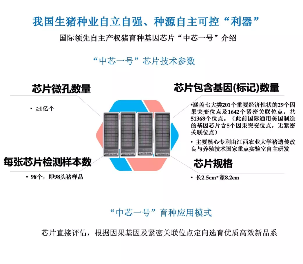 生豬種業(yè)作為產業(yè)鏈“芯片”,是我國種業(yè)主要卡脖子產品?;蛐酒N因其準確性高而成為國際主流技術。江西農業(yè)大學研究人員專心致志30多年,研發(fā)了育種性能全面超過美國的家豬新品種培育基因芯片——“中芯一號”,成為國際領先水平的基因育種主導技術。