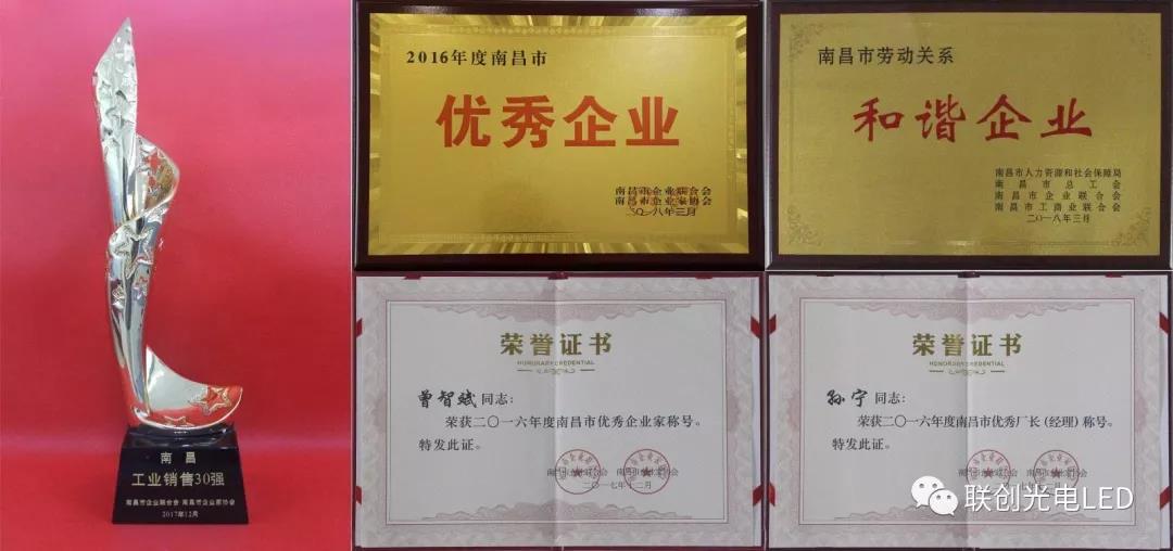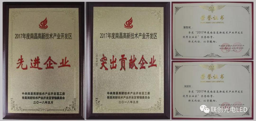 南昌高新區(qū)召開2018年經(jīng)濟工作暨科技創(chuàng)新大會,聯(lián)創(chuàng)光電被授予“2017年度南昌高新區(qū)先進企業(yè)”、“2017年度南昌高新區(qū)突出貢獻企業(yè)”榮譽稱號,股份公司董事長曾智斌、總裁助理宋榮華分別榮獲“2017年度南昌高新區(qū)優(yōu)秀企業(yè)家”稱號。