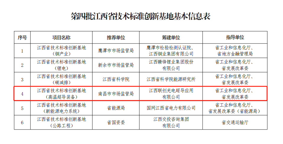 近日,省市場監(jiān)管局印發(fā)《關(guān)于同意籌建第四批江西省技術(shù)標(biāo)準(zhǔn)創(chuàng)新基地的通知》,同意江西聯(lián)創(chuàng)光電超導(dǎo)應(yīng)用有限公司牽頭籌建江西省技術(shù)標(biāo)準(zhǔn)創(chuàng)新基地(高溫超導(dǎo)裝備),這是我市獲批籌建的第2個省級技術(shù)標(biāo)準(zhǔn)創(chuàng)新基地項目。